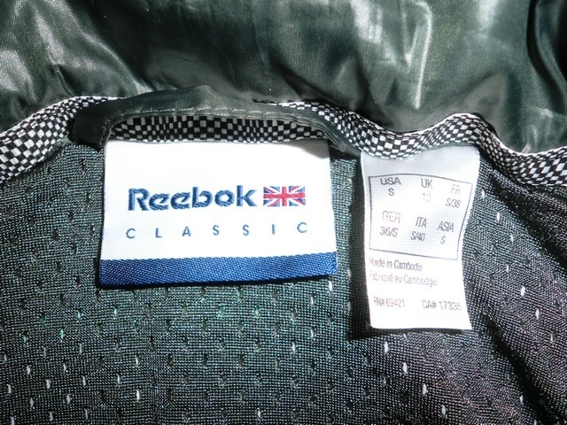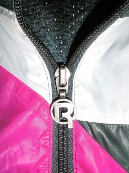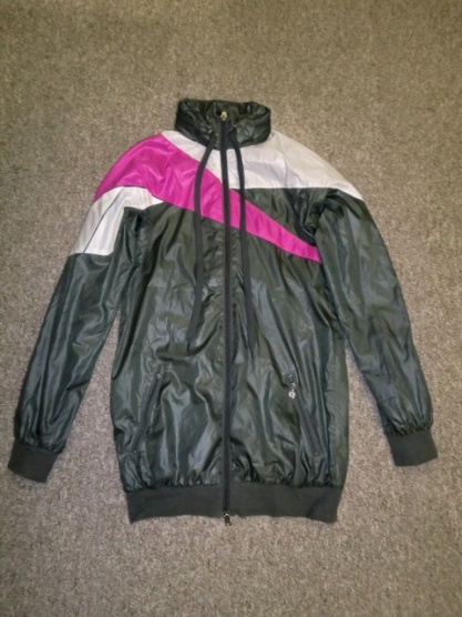 Dámská jarní/letní delší šusťáková bunda s všitou kapucí v límci na zip. Kombinace zelenošedé, fialovorůžové a bílé barvy. Kapsy na zip, konce rukávů a spodní lem stažený do patentu, síťová podšívka, za krkem zelená výšivka značky REEBOK.
