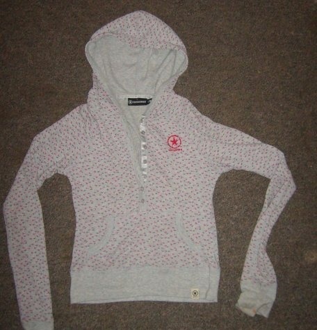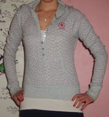 velikost psaná M ,ale já tipuji spíše S,uplně nová mam k ní ještě cedulku,dostala sem ji jako dárek,ale neunosím ji,šedivá s růžovými a tirkysovými kvítečky,s kapuckou a knoflíčkama