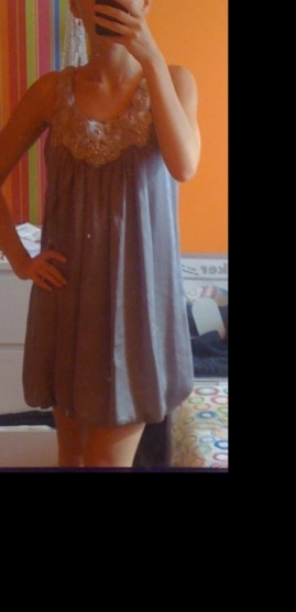 Šedo-stříbrné šatky, které jsem si přivezla z Cannes - měla jsem je jednou na sobě, jsou focené na postavě XS, ale vejde se do nich i Sko a Mko, mají totiž pružnou podšívku a vrchní část je balonová. Původní cena byla 60 eur, přenechám za 550kč.