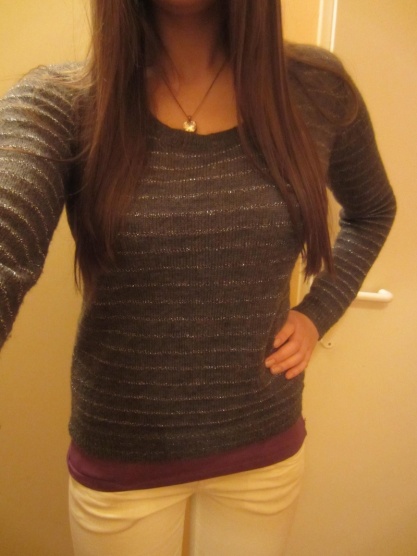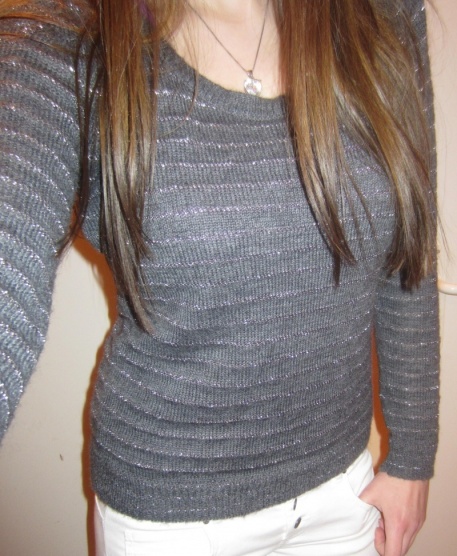 Objednaný z esprit.de, naše velikost měla být M, ale je to spíš S/M. Proužky jsou ze stříbrné nitky. Materiál je převážně s polyamidem, mohérem- 21% a vlnou 21%.