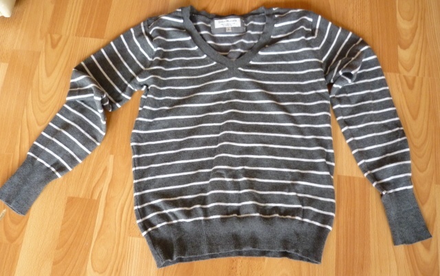 Prodám moc pěkný šedý svetřík s bílými pruhy. Velikost odpovídá S-ku.Cena 130 Kč včetně pošty
