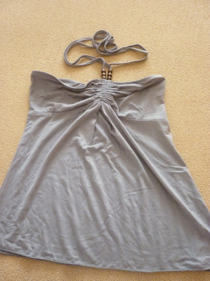 Prodám tento šedý topík. Má zavazování za krkem - na každé šňůrce 3korálky. Řasení na prsou. Velikost není uvedena, ale doporučuji na S nebo menší M. Nikdy nenošený. Cena 60Kč