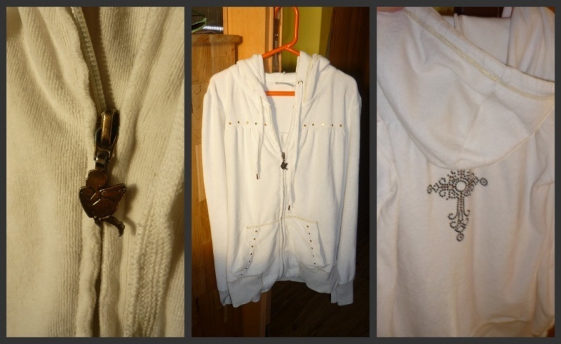 Bílá semišová mikina , příjemný materiál . Nošená ale jen krátce Dekorace jsou diamanty ( ňěkteré chybí praním ) je na zip , má kapuci která se dá stáhnout .. na zipu ozdoba andílka Amora , na zádech je s diamantu udělán kříž .. moc pěkné , na rukávech a dole na upletu zlaté prošívání . Na mikině je napsaná vel. M ale řekla bych že spíše Lko Moje cena je 99 kč