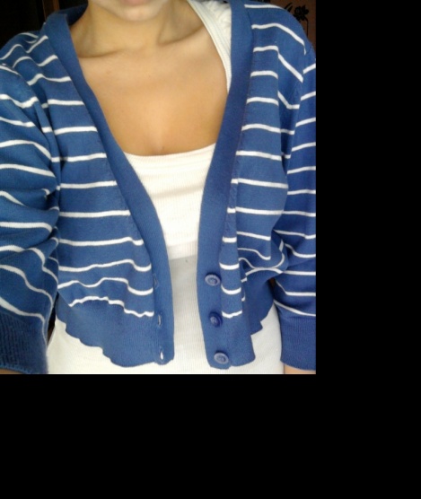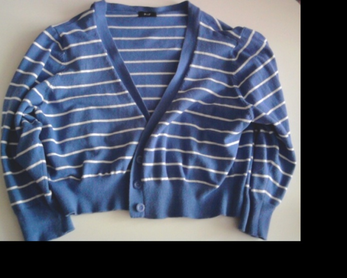 Širší pruhovaný fialový svetřík s 3/4 rukávem