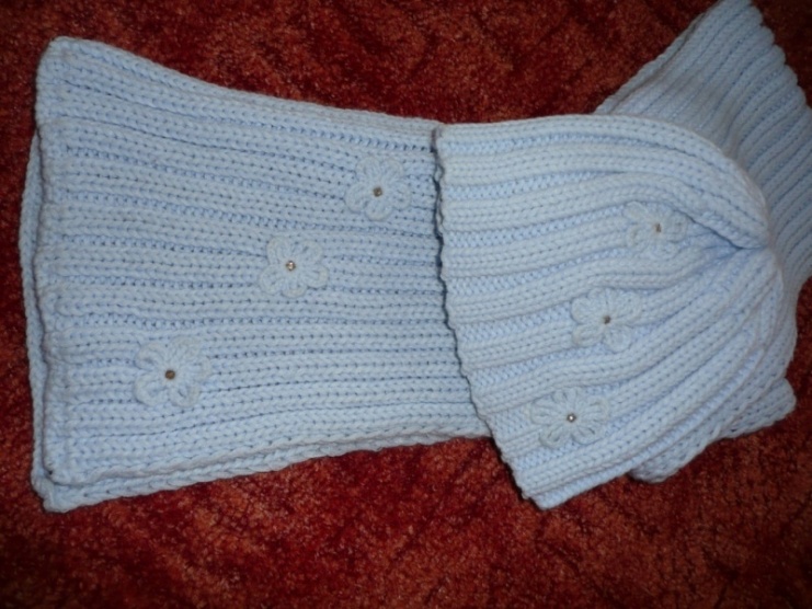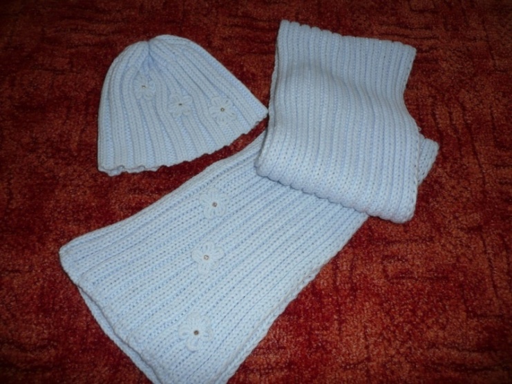 Krásná soupravička čepice a delší šály, teplá,hrubě pletená, s kytičkami, veprostřed kytiček kamínky. jestli jsem ji měla na sobě jednou,ani nevím, možná je vůbec nenošená nebo max. jednou nošená,takže úplně v pořádku. Světle modrá. Šířka 20cm, délka 190cm.