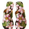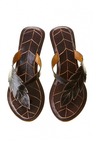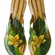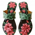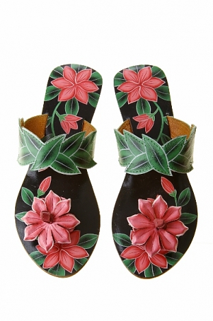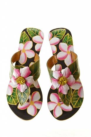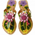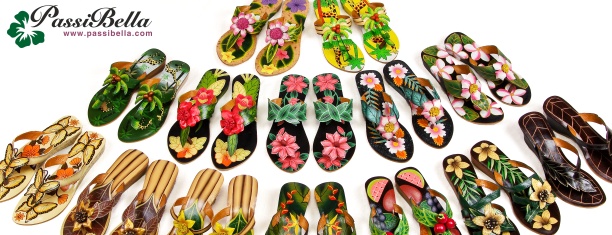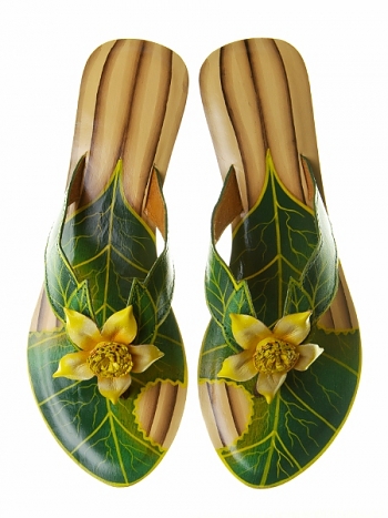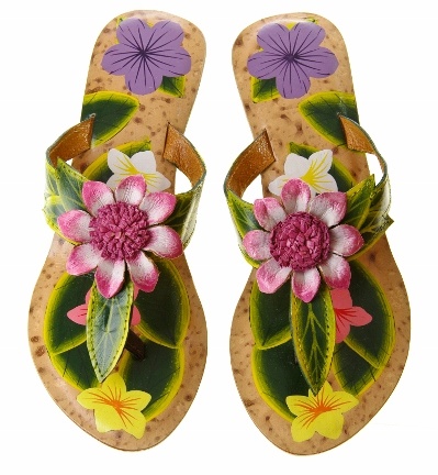 Naše sandály jsou ručně vyráběny ze 100 % přírodních materiálů, při výrobě byla použita dřevina Albasi, která se nachází pouze v Indonésii, pásky jsou z hověziny a květinové detaily, které dodávají každé botě originalitu, jsou z kozinky.