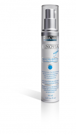 Renovia noční krém s alpskou řasou je jemný krém s hedvábnou texturou, založený na principu kombinace 3 omlazujících látek – glukonolaktonu, kyseliny hyaluronové a retinolu. Přináší zcela nové možnosti v péči o vnějším prostředím stresovanou pleť. Umožní pleti dokonalou relaxaci a regeneraci během noci, aby ráno působila odpočatě a svěže. Vyhlazuje jemné linky a navrací pleti pevnost a jas. Výtažek z alpské řasy navíc podporuje dlouhodobou hydrataci. Renovia krém představuje luxusní péči pro dokonalý vzhled pleti bez rozdílu jejího typu.