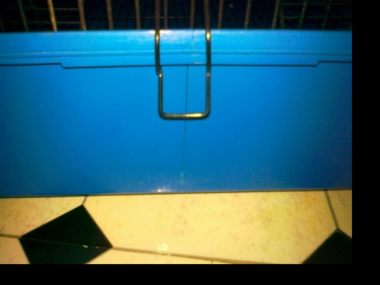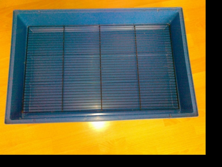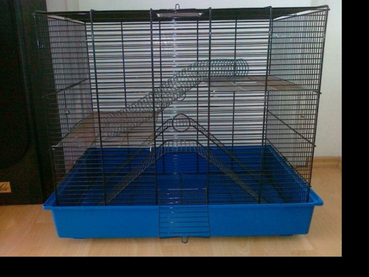 Prodám klec pro hlodavce - modrá plastová vanička, dvě patra, dvoje schody a přemístitelný tunel. Velká výhoda klece - na dně má uloženou odstranitelnou želenou mřížku, klec po stranách kryje plastovou vaničku, není tedy možné, aby zvíře plastovou vanu prokousalo. Klec je černě lakovaná, pouze patra jsou pouze z kovu - mírný rez. Na jedné straně, kde se zacvakává úchyt, je plastová vanička naprasklá - spíše estetický problém, vana je kryta klecí, zvíře ji tedy neprokouše.
