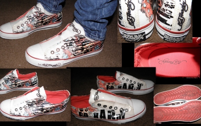 Prodám nebo vyměním originál boty ed hardy jsou z pogumovaného materiálu, barva do červena,měla jsem je asi 3x na sobě ale jsou mi malé, hodí se jak k úzkým kalhotum tak volným.PC 1800,- nyní je prodám za 1000,- popř. nabídněte výměnu.