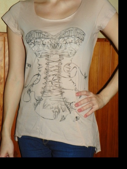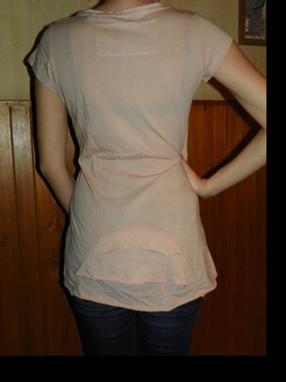 0Nabízím starorůžové tričko značky Next s velice originálním potiskem ve tvaru korzetu, s prodlouženým zadním dílem a volánky nad zadečkem