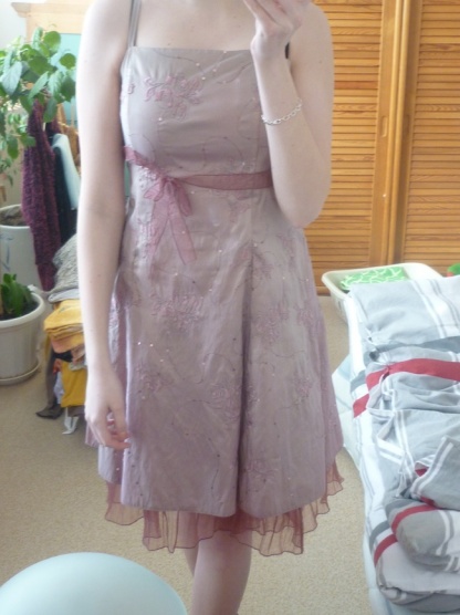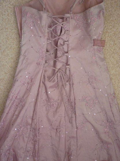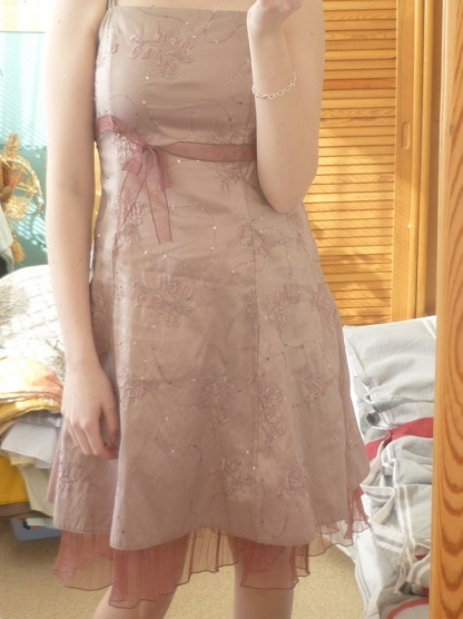 Prodám tyto starorůžové vyšívané šaty s růžemi a poseté flitry. Vepředu mašlička, dole přesahující suknička. Velikost S-M. Na sobě jsem je měla jednou. Vzadu je šněrování. Zapínají se na zip. Trochu hůř se zapíná, proto cena 100Kč + pošta.Původní cena byla 499Kč. Délka 92cm, pas 36cm.