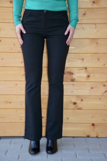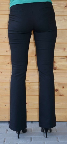 Strečové kalhoty vepředu se dvěma kapsami. Snížený pas 34.5 cm x 2, boky 44 cm x 2, vnější rozměr 98 cm, vnitřní rozměr 76 cm