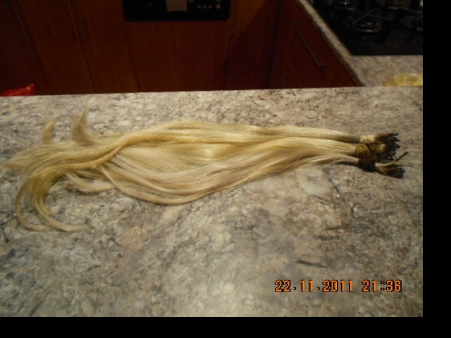 Krásné středoevropské panenské vlásky v nejvyšší kvalitě, vlásky jsou krásně vlnité, původní barva byl blond melír s hnědou, já jsem vlásky obarvila všechny do mého odstínu do popelavé blond, takže spoje jsou tmavší, aby původně zapadaly do toho tmavšího melíru! Nošeny byly na metodu bellargo (můžete využít na bellargo, bond a nebo ring), spoje jsou ve tvaru "I" a tudíž vhodné na všechny tyto metody. Vlásky byly nošeny cca půl roku, jsou nádherné, kvalitní, jemné a hebké, vhodné pro jemné vlasy! Vlásky si můžete obarvit do svého odstínu nebo na svou barvu!