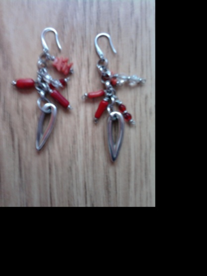 Stříbré visací náušnice s červenými ozdobami. Délka 9 cm.