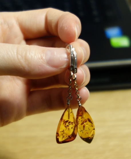 Délka 5.5 cm, z toho jantar 2.5 cm. Lehce rozdílný tvar obou jantarů viz fotka. Pořizovací cena 1500,-.
