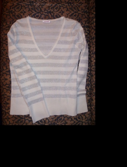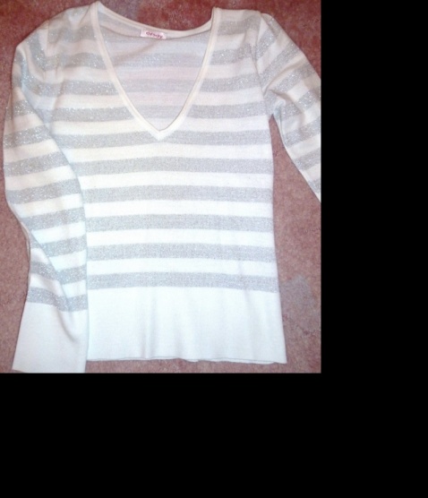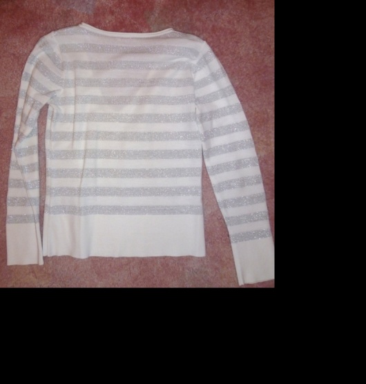 0Prodávám krásný proužkovaný svetřík. Stříbrné proužky se třpytí. Velmi zachovalý. Velikost bych řekla spíše M, ale může být i na L. Cena 150 Kč včetně poštovného!
