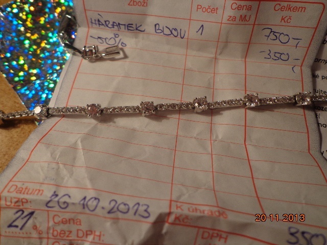 1Nabízím krásný náramek, který se nádherně třpytí, je nový, dokládám i účtenku, že původní cena byla 350kč, vhodný jako dáreček k Vánocům, vč. dárkového balení. Materiál: stříbro