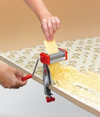 My máme strojek na nudle doma, ale neválí sám těsto, jak je ukázané na tvém obrázku. My tam vložíme už vyválené těsto rozkrájené na plátky, pak točíme kličkou a z druhé strany nám padají malé nudličky