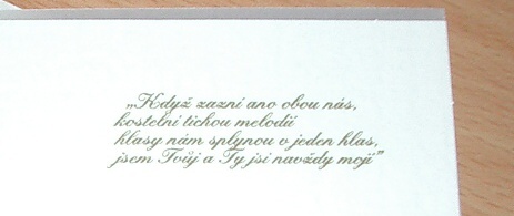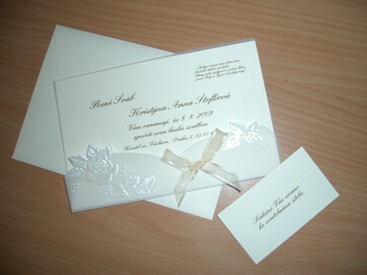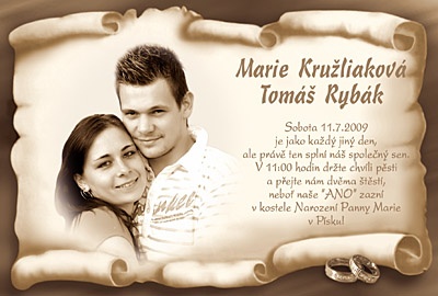 My měli jednoduché. Ale už jsme měli prcka. Byla tam jeho černobílá fotka,přes ní ten poloprůsvitný papír,svázané malou mašličkou a text: Chtěl bych Vám říct novinku. Tatínek si vezme maminku. Kdy a kde? Přece.... ..na zámku. Pak něco a podpis.