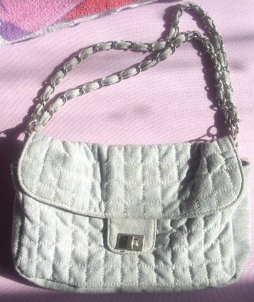 Světle šedá kabelka s řetízkem. Řetízek je schovaný v kabelce. Dá se vytáhnout a nosit kabelku jako crossbody, nebo na rameno. Jedna velká kapsa a v ní je přihrádka na telefon a jedna menší kapsička na zip.