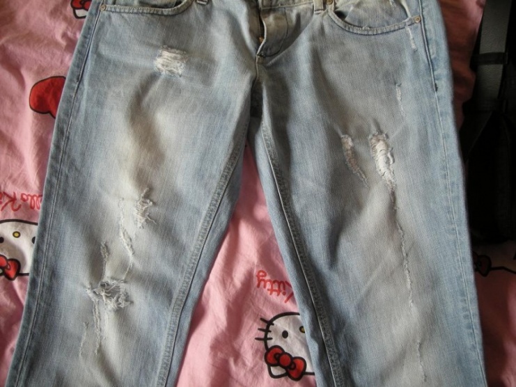 0Prodám tyto krásné džíny, bohužel mi jsou trošku větší. Nerada se jich zbavuji. pas 44cm, boky 54cm, přední sed 20,5cm, délka 100cm. Vepředu trhaný efekt.