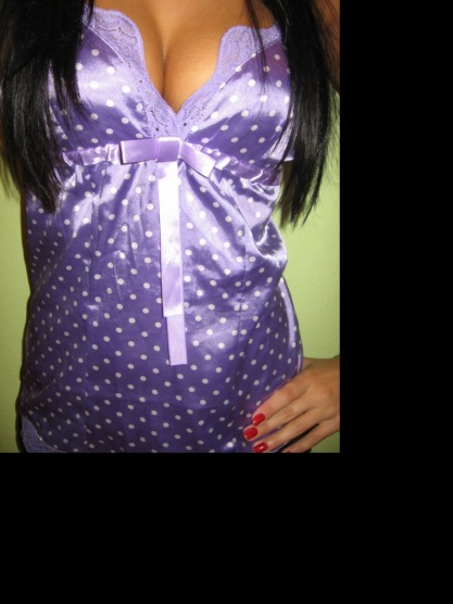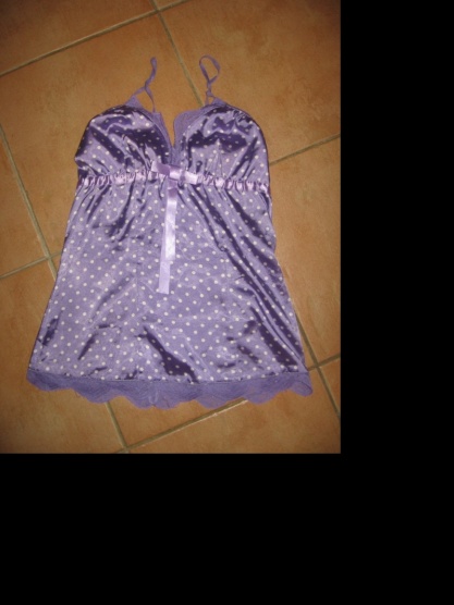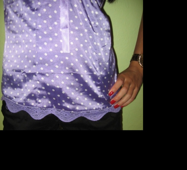 Prodám párkrát vzatý světle fialový topík Amisu, s bílými puníčky a krajkou po obvodu.