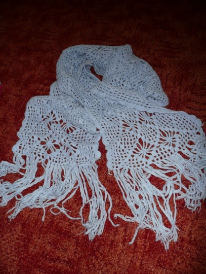 Prodám dvakrat vzatou šálu, háčkovaná, pěkný vzorek, teploučká, leží mi ve skříni.