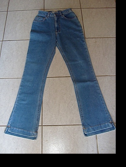 Míry: délka od rozkroku - 79 cm, pas 60 cm, šířka nohavic dole 42 cm. Přední díl nohavice je kratší i necelý 1 cm - zdoben drukem. Velice hezké.