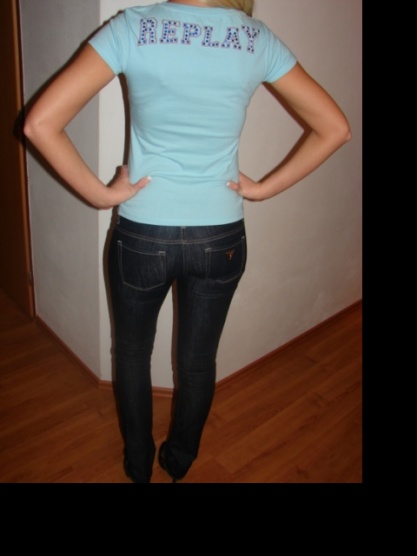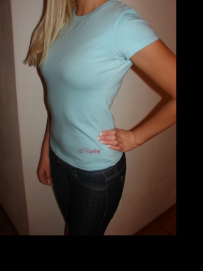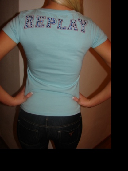 Krásné světle modré tričko replay, minimálně nošené jako nové, na přední straně je dole malý červený nápis replay, na zadní straně velký červený nápis vykládaný modrýma kamínkama. Opravdu luxusní nepřehlédnutelný kousek. Velikost S, rozměry: délka 57cm, šířka přes prsa 38cm. Cena 499Kč. Poštovné 37Kč.