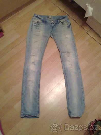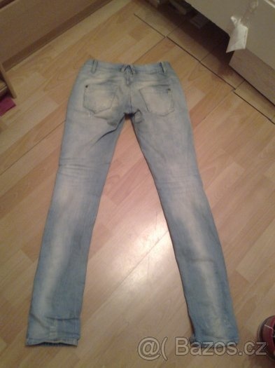 Jsou nošené, místy jakoby "roztrhané". Vzhledem k tomu, že se mi z vnitřní strany stehen trochu rozšoupaly, vyřešila jsem to tak, jak jsou řešeny ostatní "trhance" z výroby. Jsou mi už velké, tak se někomu třeba ještě hodí.