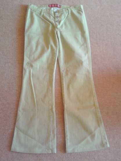 rozšiřující nohavice. kalhoty mají tři knoflíky na zapínání. dá se přidat pásek