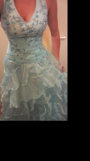 Poslední dva spodní volánky jsou poškozené,odtržené, oprava není nutná, když se odstraní, vůbec tam nechybí a nic není vidět. Takto jsou šaty dlouhé na výšku 171 cm bez bot, dají se zkrátit, odebráním volánků