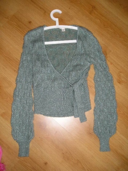Velikost je XS, ale oblékne i S a M. Je protkán stříbrnou nití, takže se třpytí. Je zavinovací. Málo nošený.