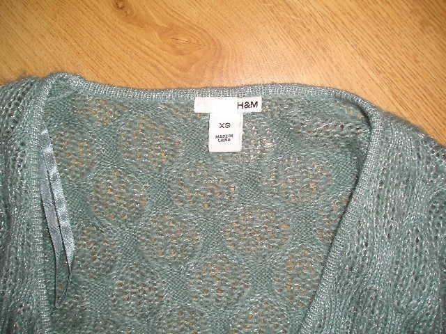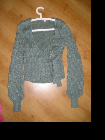 Velikost je XS, ale oblékne i S a M. Je protkán stříbrnou nití, takže se třpytí. Je zavinovací. Hodně málo nošen....