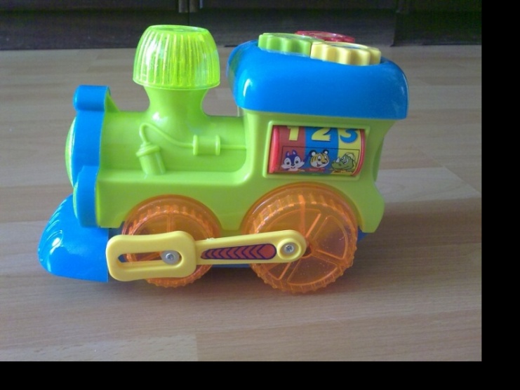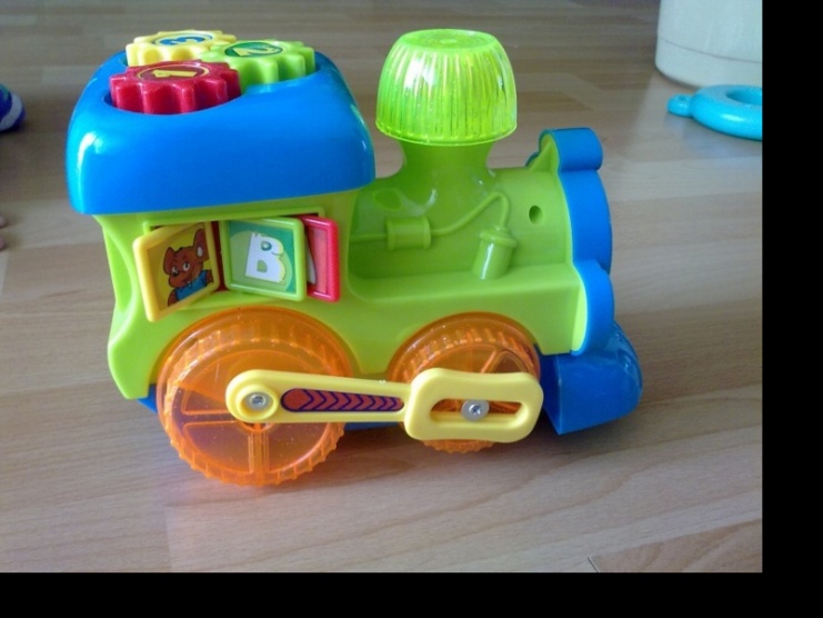 Má na sobě součásti, které rozvíjí dětskou motoriku- na boku otáčecí váleček se zvířátky, čísly 1 2 3 a písmenky A B C. Na stříšce tři otáčivé koutoučky a na druhém boku tři destičky se zvířátky a písmenky.