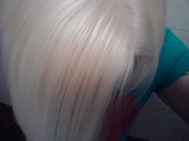 Už běhěm barvení bylo vidět jak postupně během působení se barva rychle mění z oranžové do žluta a ke konci do bíla. No a ten fialový šampon to jen doladil.