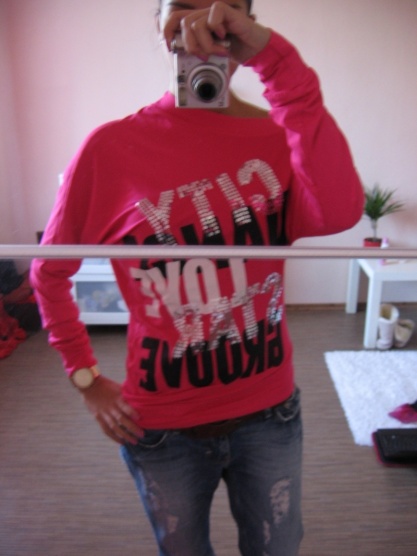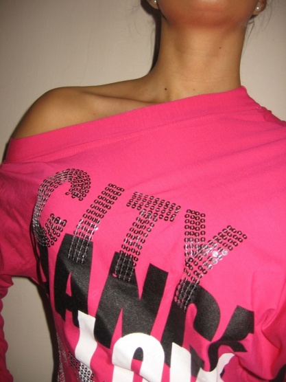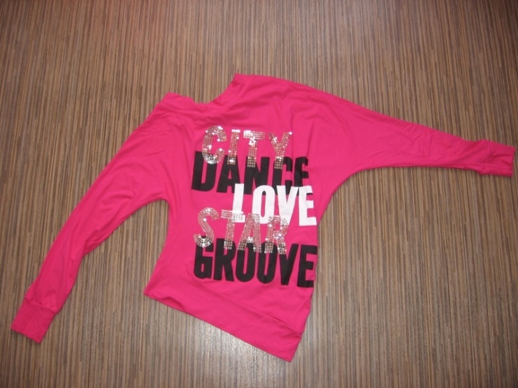 Prodám nenošené růžové tričko s nápisy z flitrů na jedno rameno.