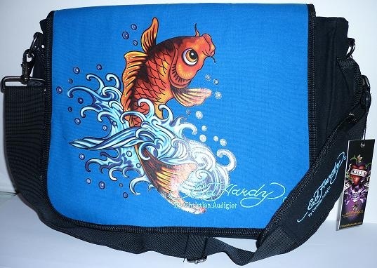 Nabízím úplně novou tašku přes rameno značky Ed Hardy, rozměry jsou 37x30x9 cm. Materiál 100% bavlna. Zvenku na víku potisk (kapr Koi) a výšivka (značka výrobce). Dále potisk s názvem výrobce na obou bocích, zadní straně brašny a ramenním polštářku; zezadu po celé délce kapsa bez zapínání; vevnitř malá kapsička na zip a dvě malé kapsy bez zapínání, hlavní komora je s celoplošným potiskem s názvem výrobce; na bocích dvě zapínací kapsy např. na mobil.