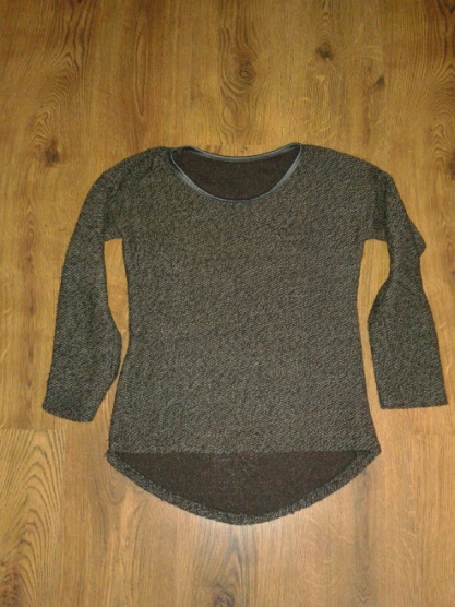 Melírovaný teplý pletený svetr - hnědo černý s koženkovým lemem kolem výstřihu