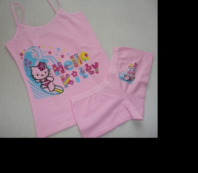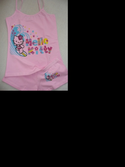 Prodám krásný nový komplet kalhotky a tílečko, i k nošení na ven, barva růžová, s kočičkou Hello kitty, velikost S. Nevhodný dárek, úplně nové, jen vyfocené.