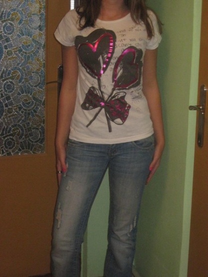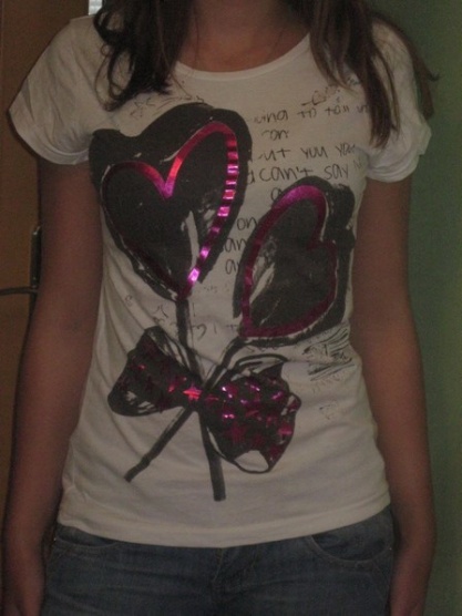 0Krásné tričko s potiskem velikosti M/L, odpovídá spíše M. Měla jsem ho snad jednou na sobě, takže skoro jako nové. K tomu zdarma bílé tílko, párkrát použité.