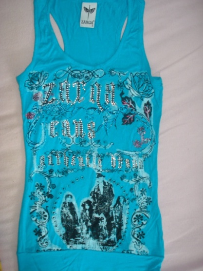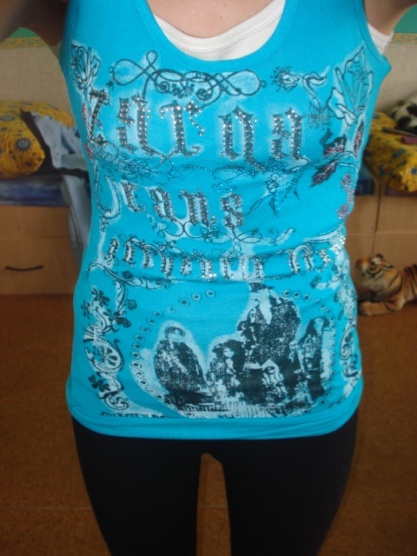 0Nabízím nové tílko tyrkysové modré barvy s kamínky na přední i zadní straně.