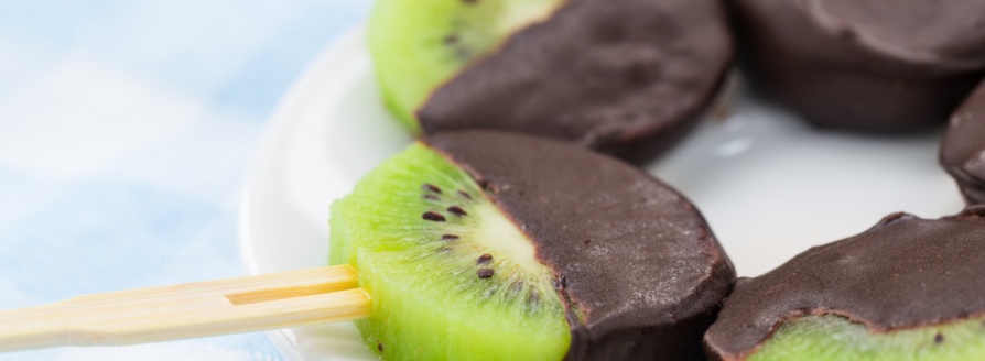 Na mírném ohni svař cukr s vodou, až vznikne karamel. Kiwi nakrájej na silnější kolečka (plátky) oříšky nasekej nahrubo. Ovoce napíchej na špejle od nanuků, namáčej v rozpuštěné čokoládě nebo karamelu a obal v oříšcích.