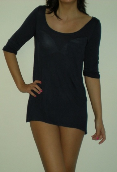 Lehké tmavěmodré triko z HM. Zadní část delší než přední - možno nosit k legínám, šortkám, menší postavy i samostatně. Na pravé straně je na prsou kapsička. Rukávy jsou u loktů zahnuté. Cena 250 i s poštovným.