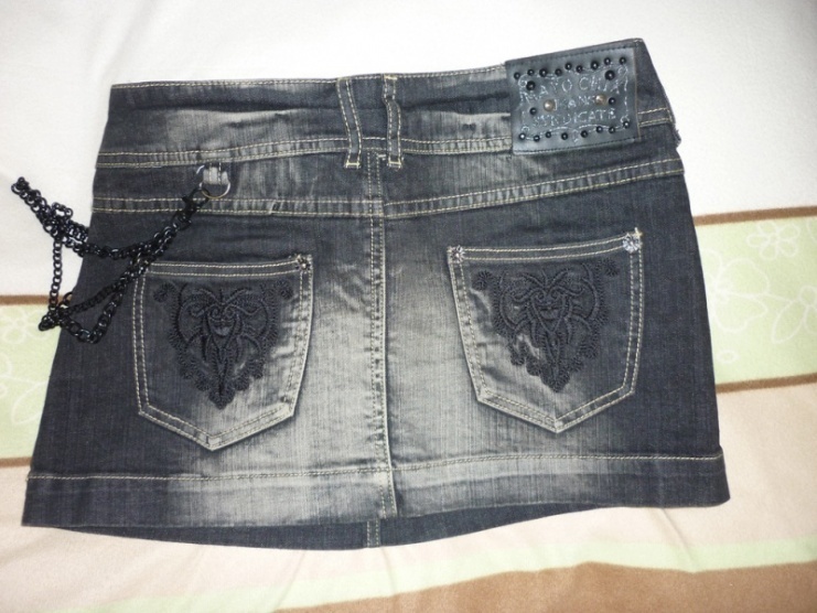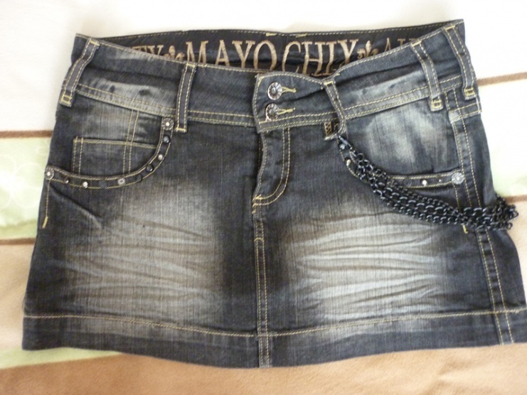 Prodám tuto sukýnku značky Mayo Chix z tmavé džínoviny. Sukně má krásné detaily, vzadu jsou vyšívané kapsy, vepředu u kapes kamínky + řetěz, který se dá oddělat. Nošená minimálně, takže top stav. Zhubla jsem a už ji nevynosím. Míry: boky 41cm, délka 32cm.