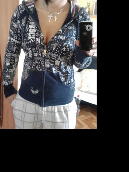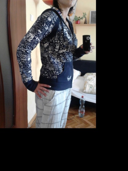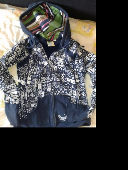 Nošená ale nezničená lehounce vybledlá barva (stačí párkrát vyprat v gelu na tmavé prádlo a bude jak nová), poseta bílými nápisy motivy roxy. Na zádech malé proužkaté srdíčko jako v kapuci. Hodně zajímavě řešená. Prodloužené rukávy s dírou na palec. Obměňuji šatník jinak bych se jí nevzdala PC.1850kč nyní 300kč