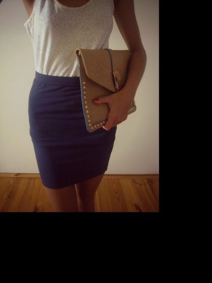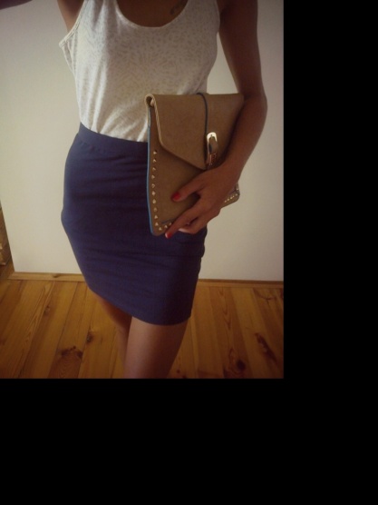 Tmavě modrá barva. Sukně je elastická, nikdy nenošená, je mi volnější.