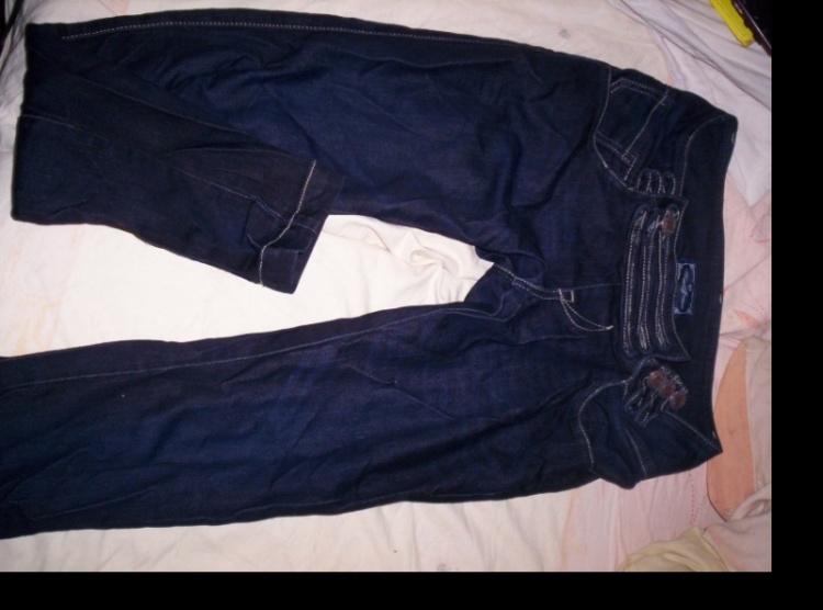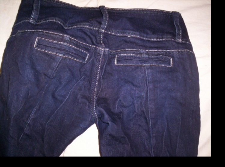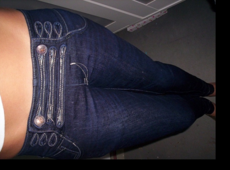 Tmavě modré džíny, trošku prosvítá bílá vlákna, velikost XS, uzoučké a těsné, zajímavě řešené zapínání. Cena 400 Kč. Prosím SZ.