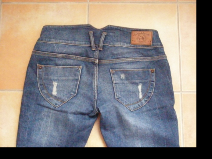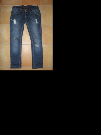 Mnou párkrát nošené, top stav! Módní trhaný styl. Pův. cena 1.100,-- Moderní úzký střih. Velmi pohodlné. Krásně tvarují zadeček. Ve skutečnosti ještě více tmavší modrá než na fotce. Míry: Pas 41-42 cm, Boky cca 48 cm. Zasílám doporučeně.