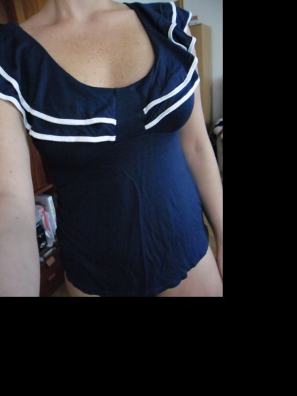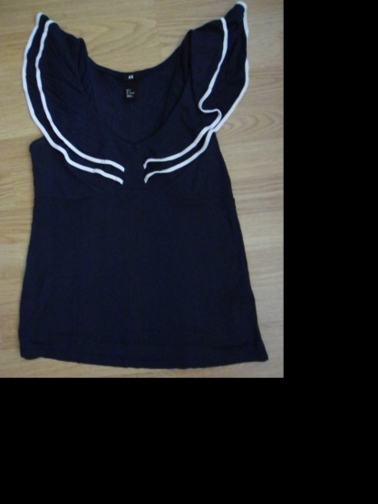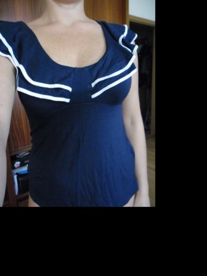 Námořnické tmavě modré tričko s bíle lemovanými volánky. Neunosím a tak posílám dál. 2x oblečené. Střih mírně do A. Přes bříško malinko volnější. Triko je jako nové, bez známek užívání.